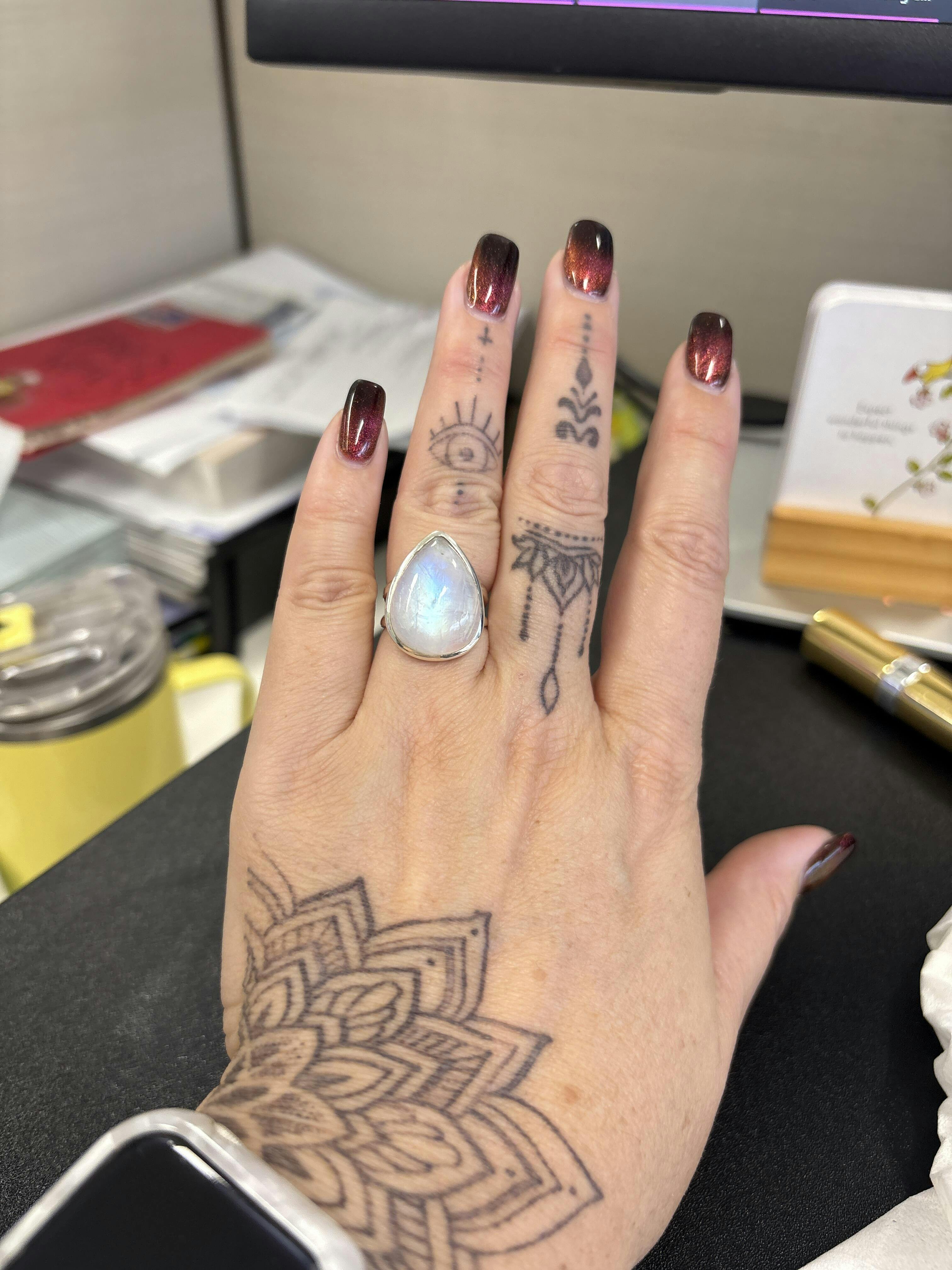 Embrace the moon's mystical energy with the Ethereal Moonstone Ring. A stunning pear-shaped moonstone, its surface reflecting an otherworldly shimmer, steals the show. Two hand-hammered silver bands, with a cool, organic texture, frame the stone with a handcrafted feel. This ring adds a touch of effortless boho chic to your everyday look.