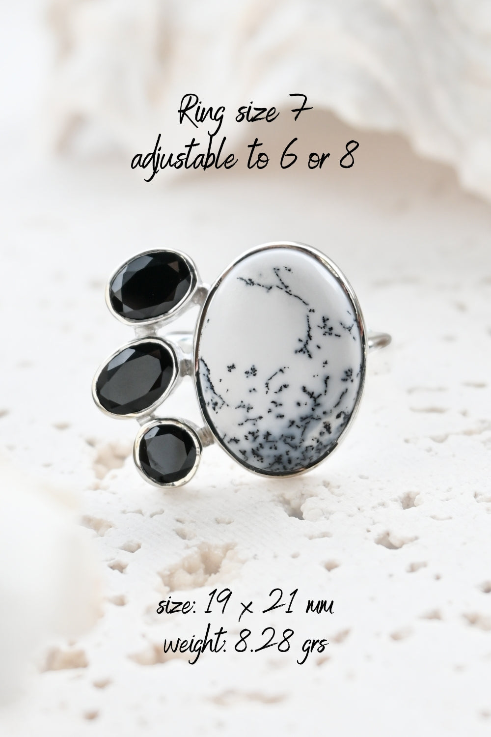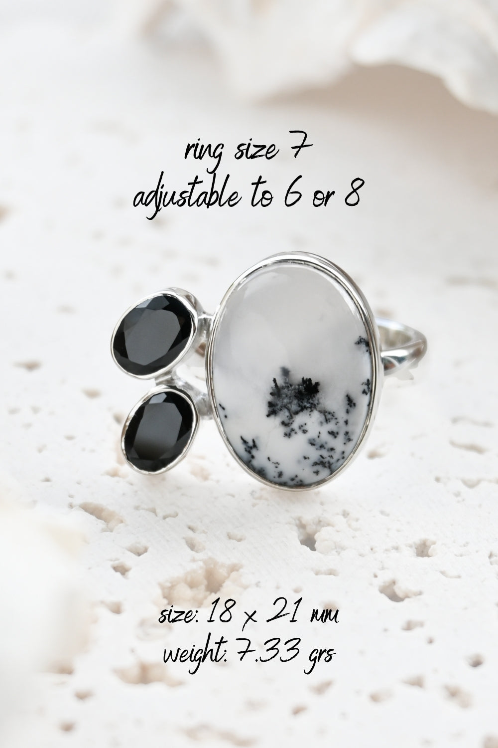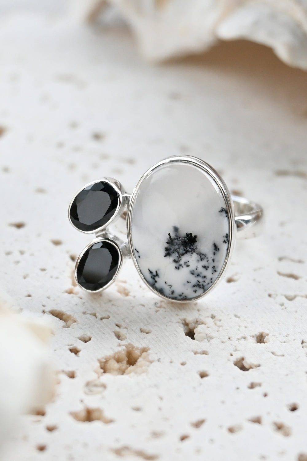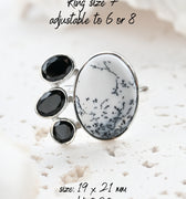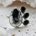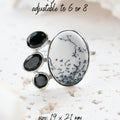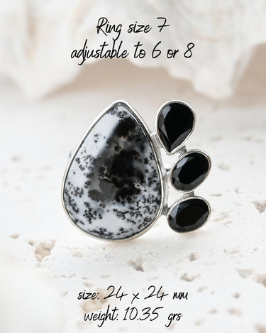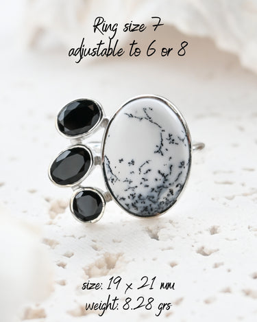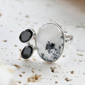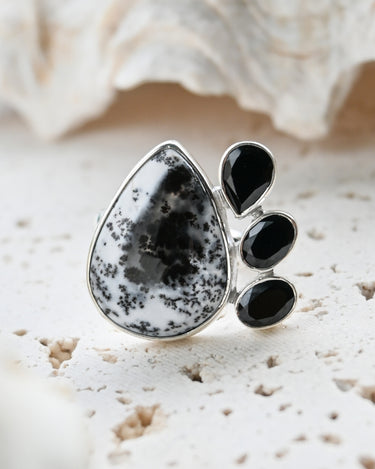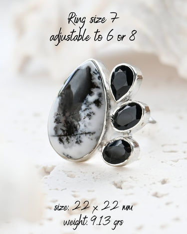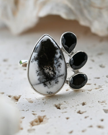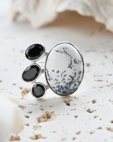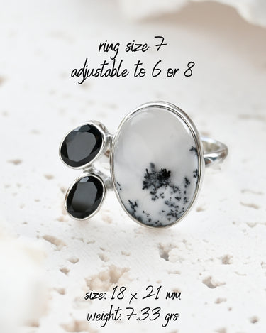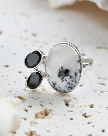 Dendritic Opal carries delicate, tree-like inclusions that seem to capture nature in motion. A reminder of balance and growth. Black Onyx, sleek and grounding, anchors this energy with quiet strength and protection. Together, they create a ring that speaks of contrast, clarity, and transformation.