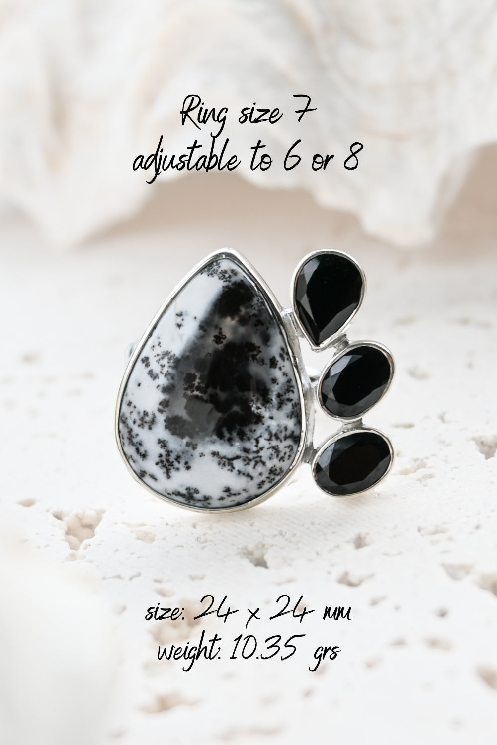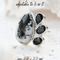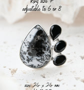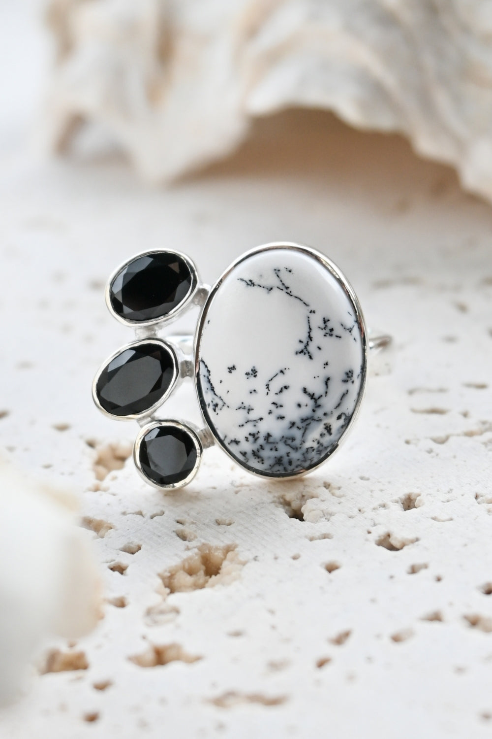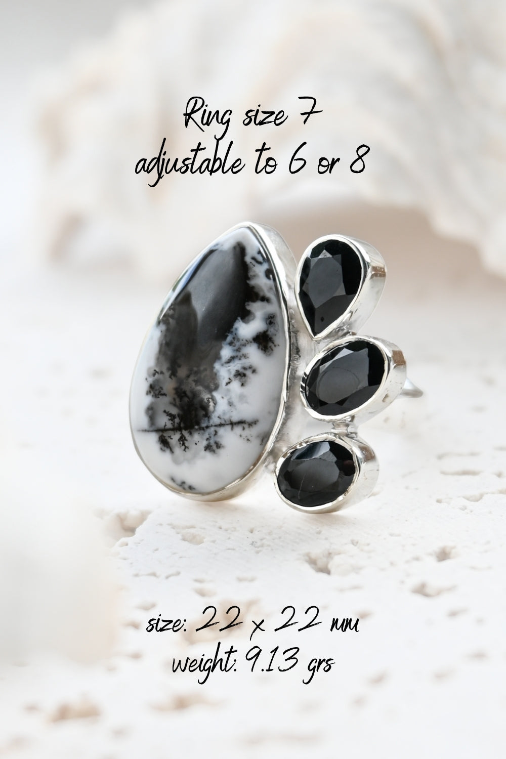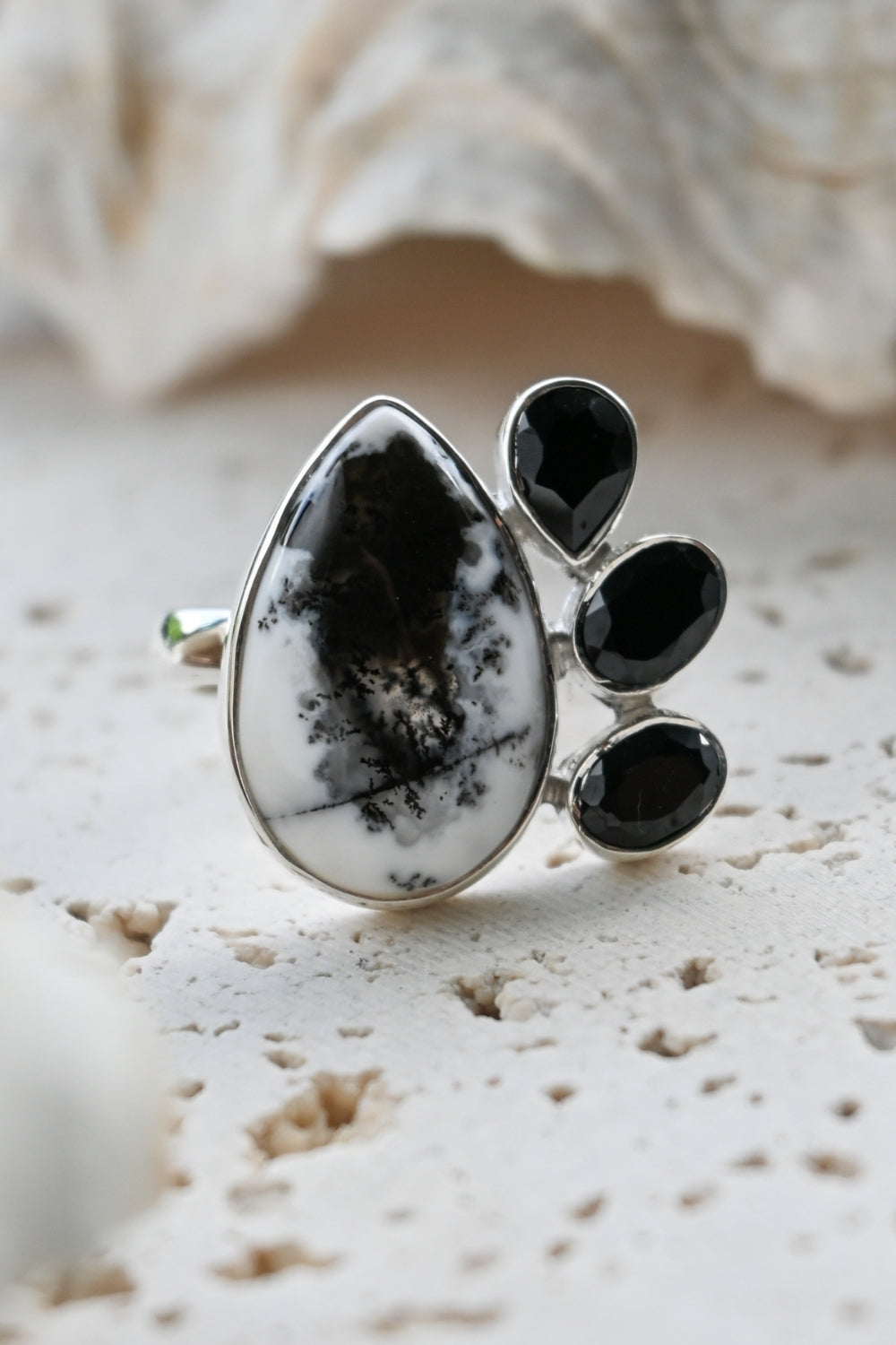 Dendritic Opal carries delicate, tree-like inclusions that seem to capture nature in motion. A reminder of balance and growth. Black Onyx, sleek and grounding, anchors this energy with quiet strength and protection. Together, they create a ring that speaks of contrast, clarity, and transformation.