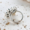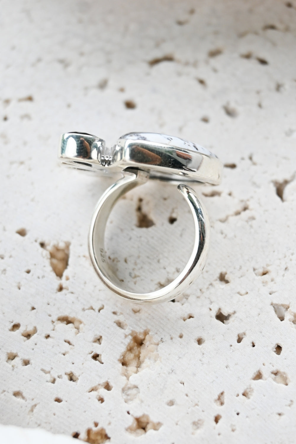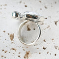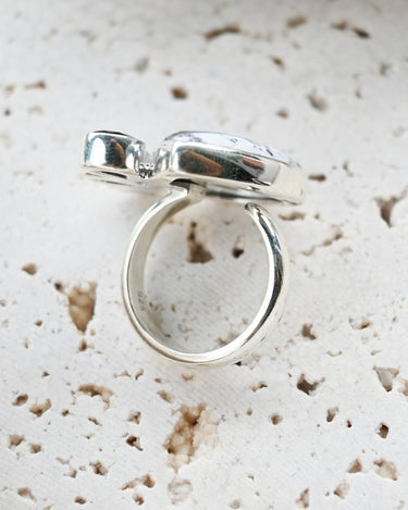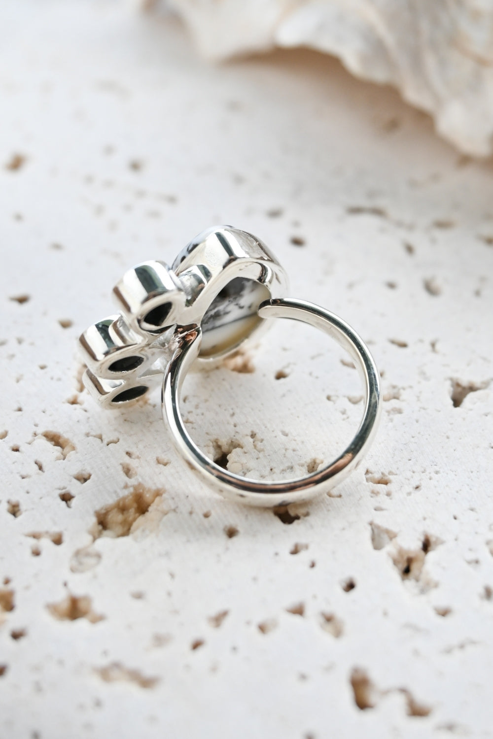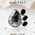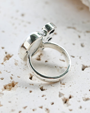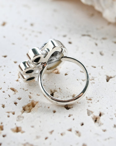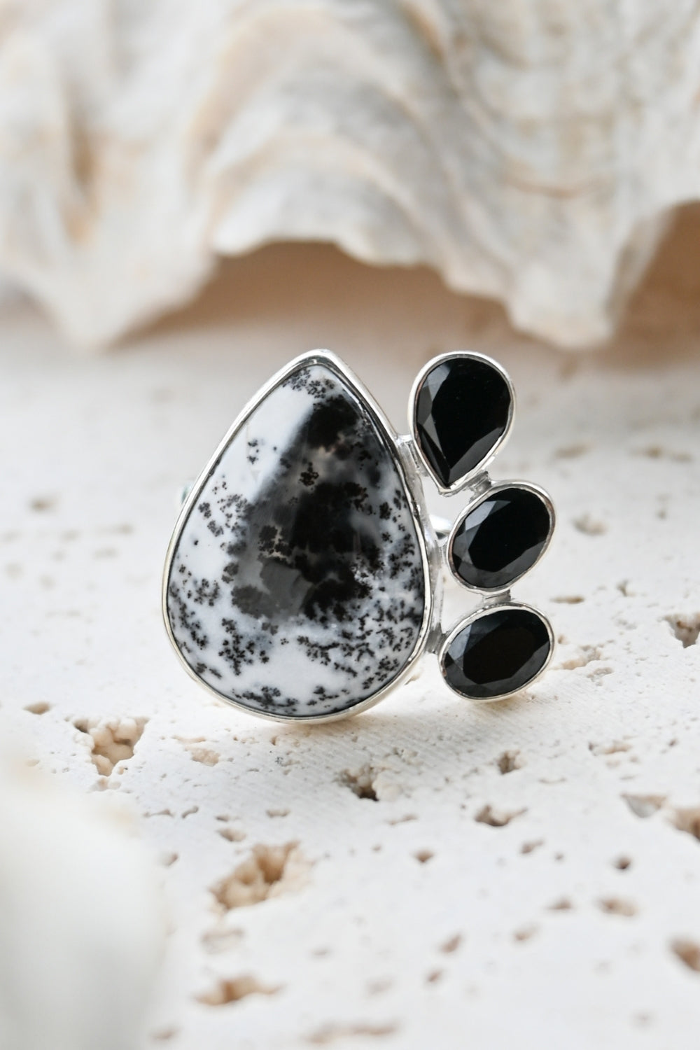 Dendritic Opal carries delicate, tree-like inclusions that seem to capture nature in motion. A reminder of balance and growth. Black Onyx, sleek and grounding, anchors this energy with quiet strength and protection. Together, they create a ring that speaks of contrast, clarity, and transformation.