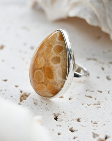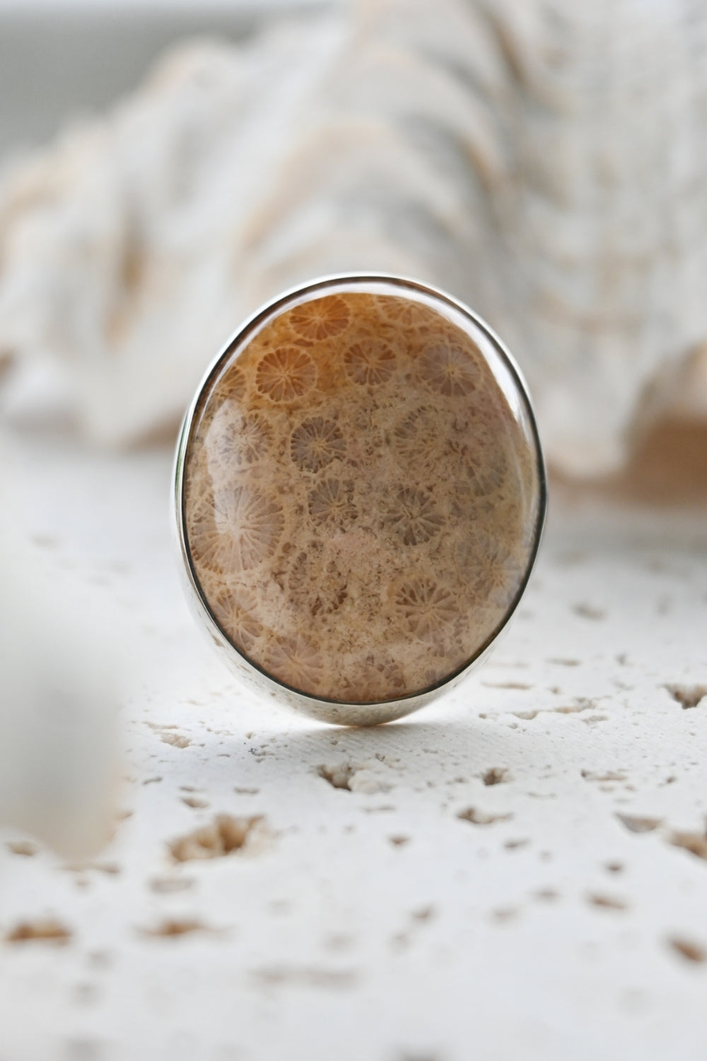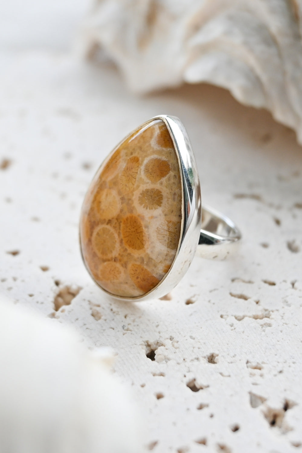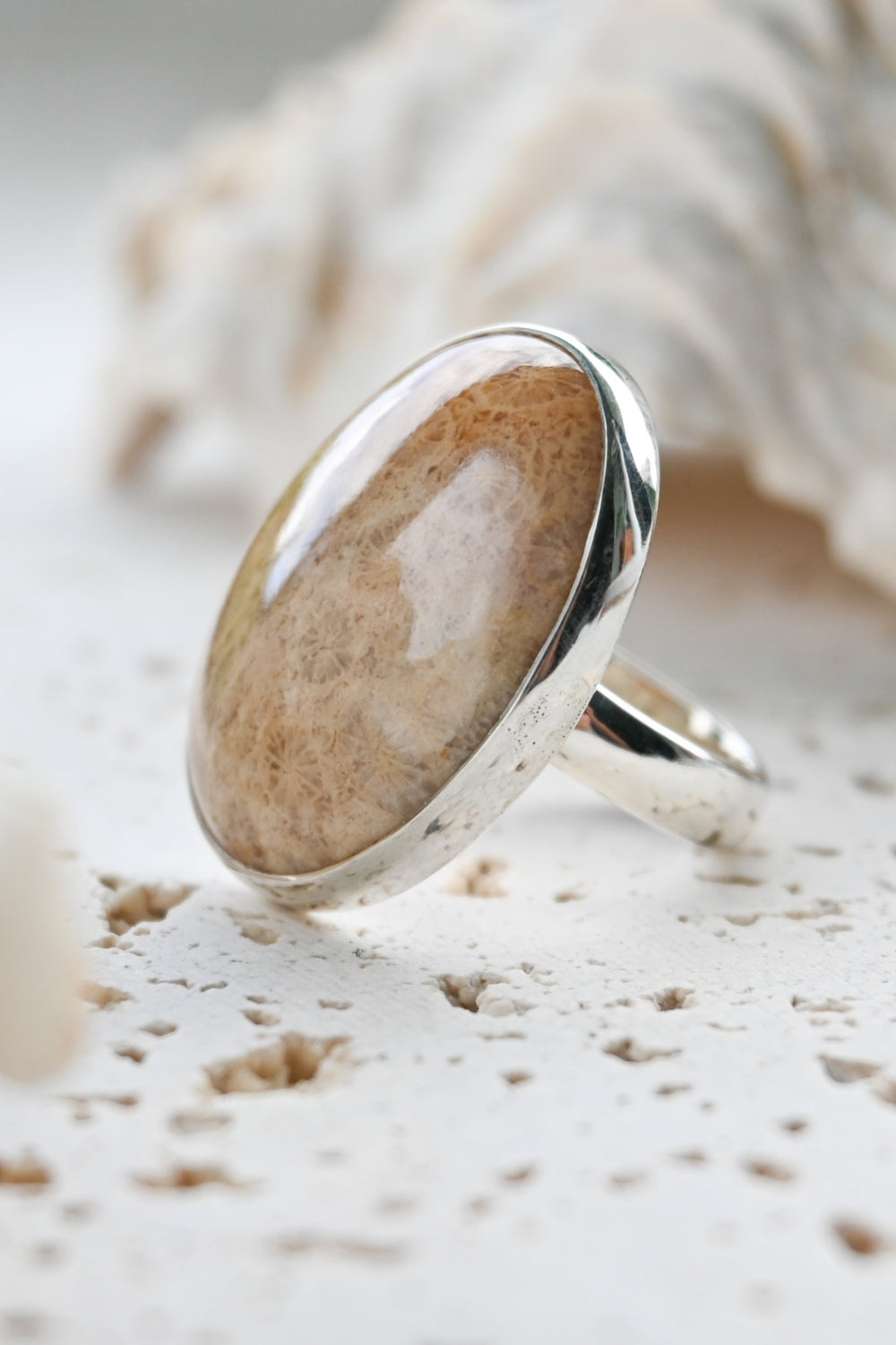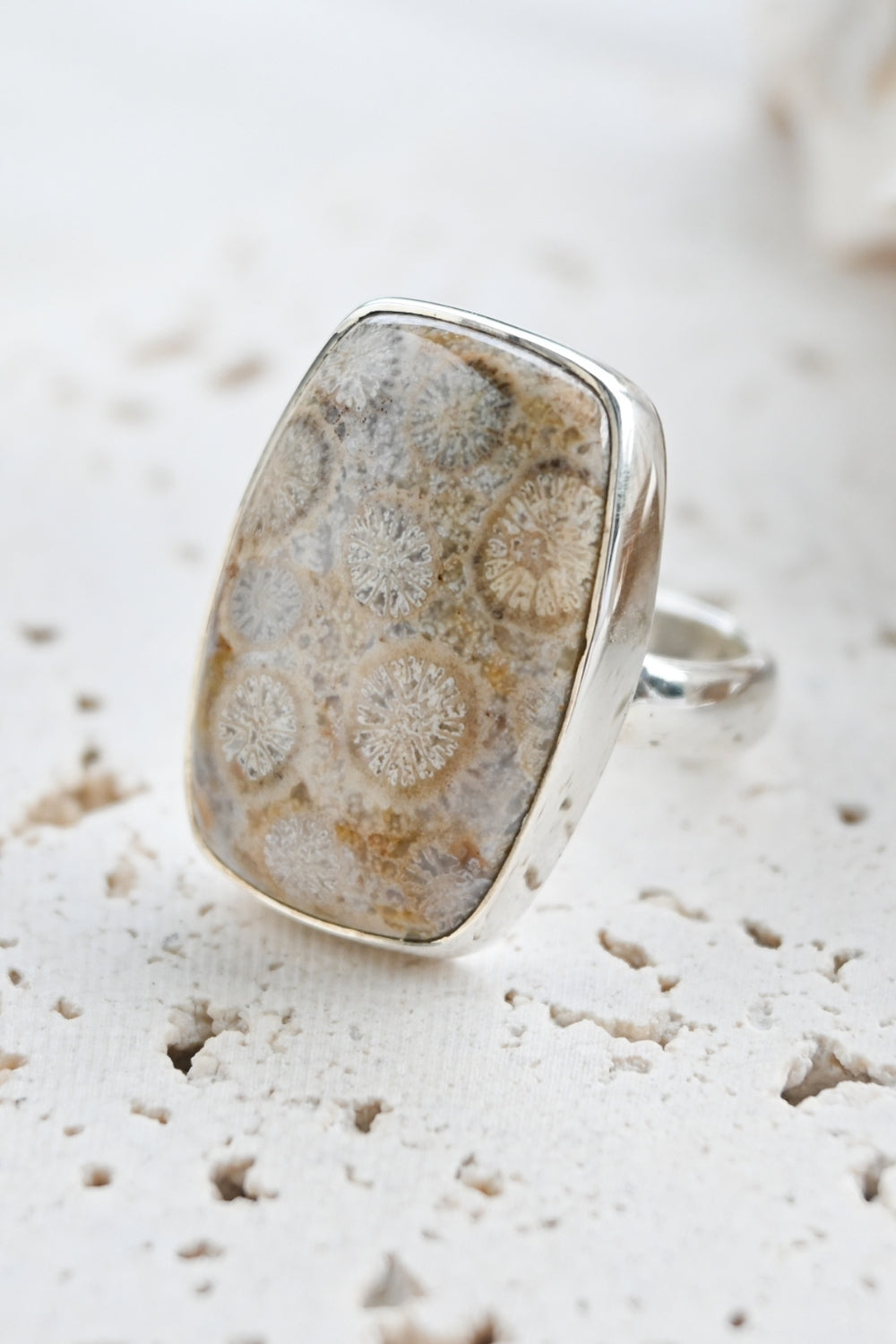 Each piece is handcrafted in sterling silver and set with natural fossilized coral, a gemstone created when prehistoric corals slowly transformed into stone through the gentle process of mineralization.
