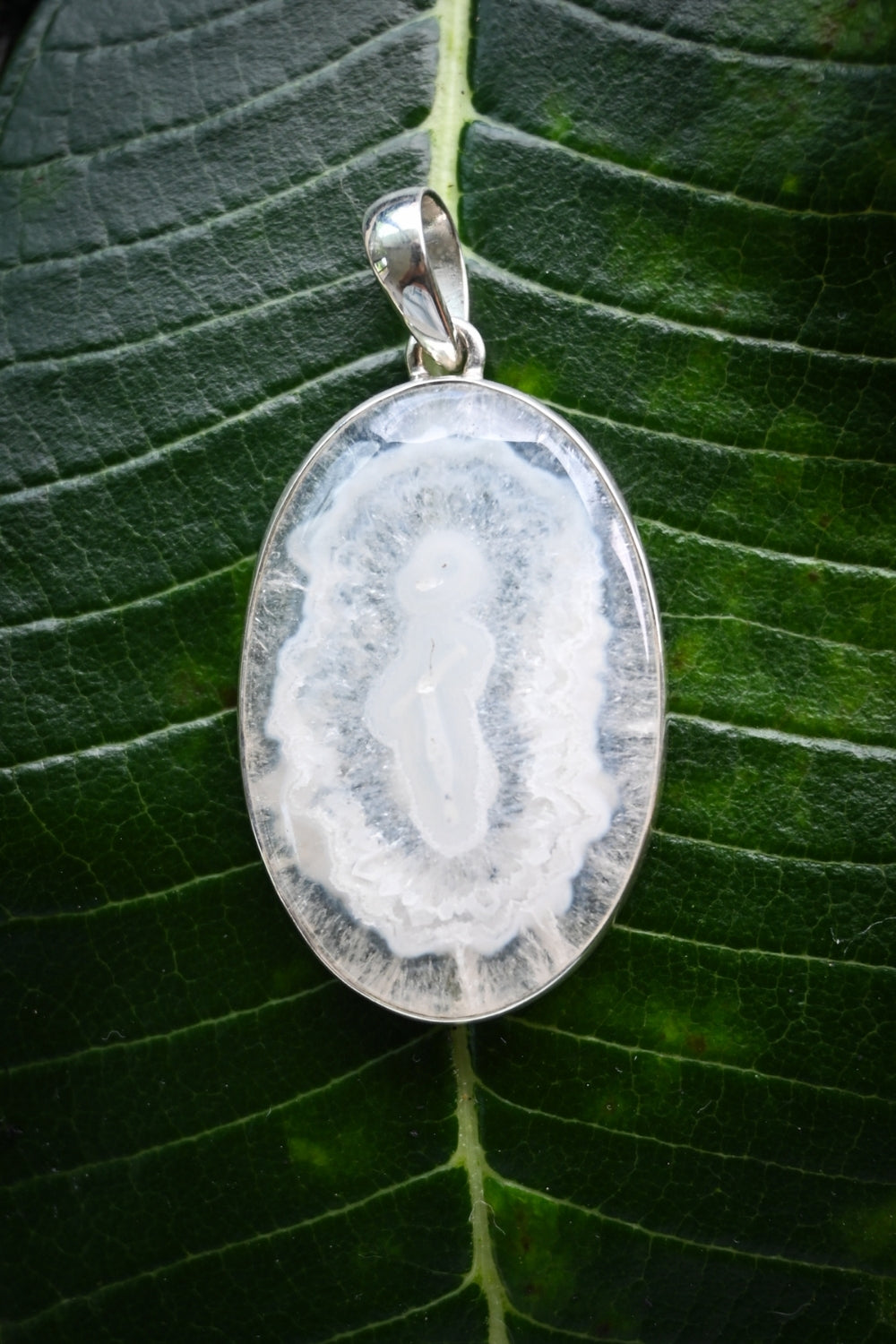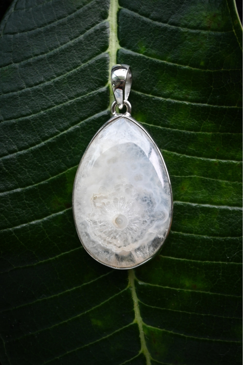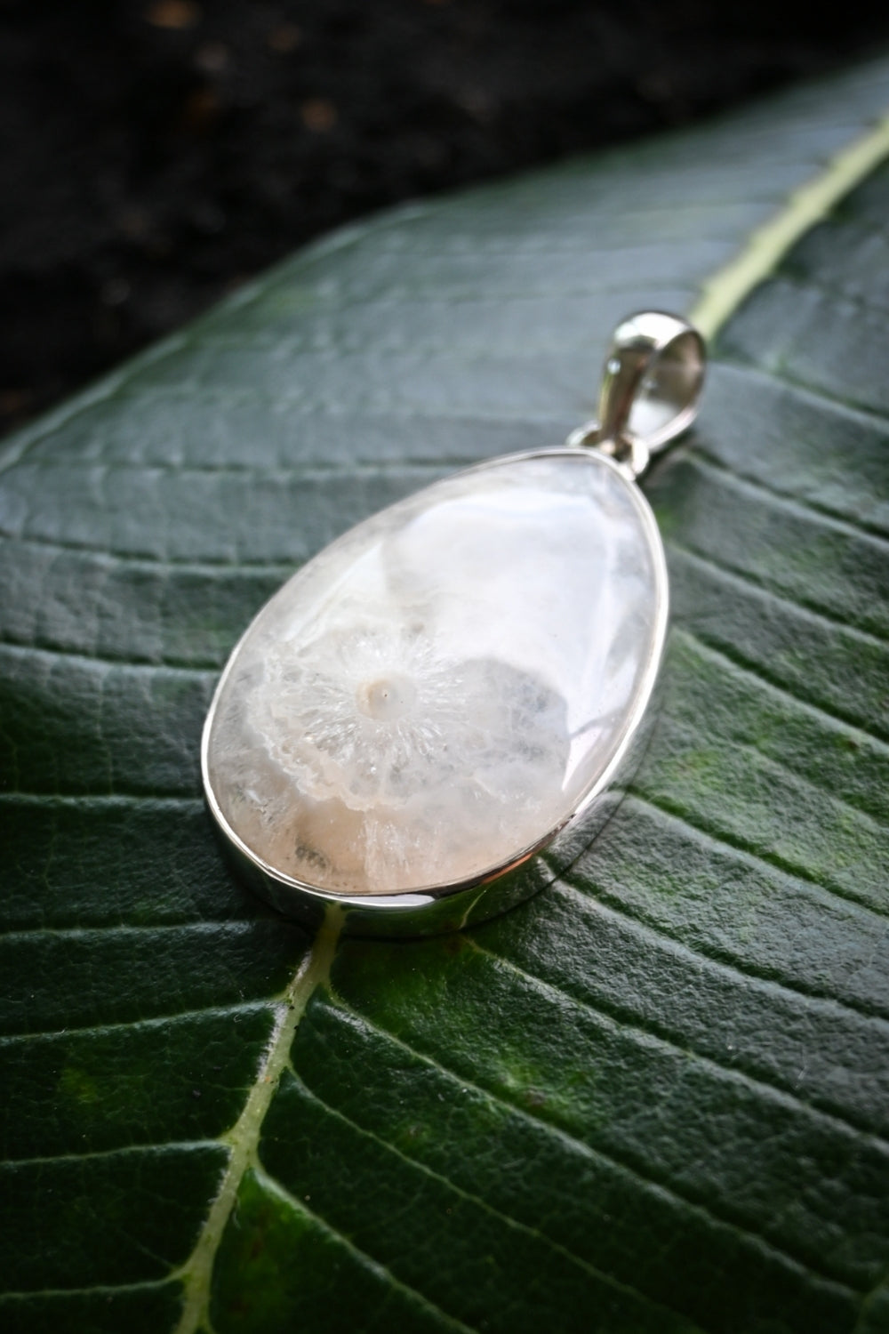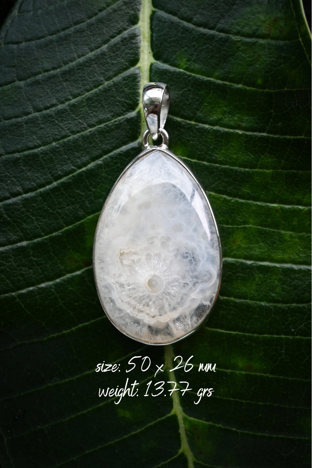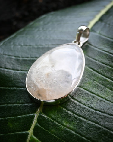 Handcrafted in sterling silver, this pendant showcases the celestial beauty of Polar Quartz: a crystal known for its frosted transparency and intricate inner formations that resemble ice flowers or distant stars.