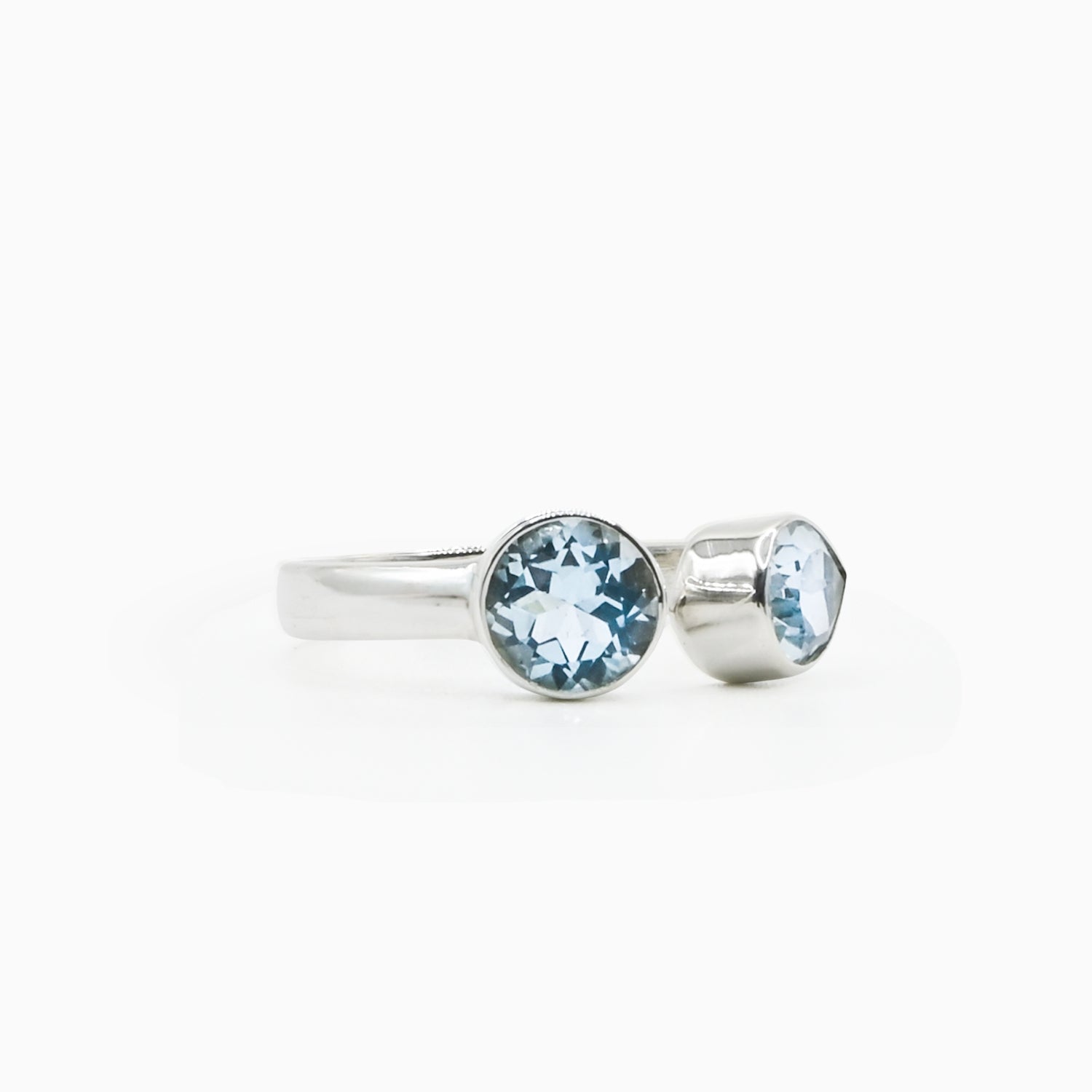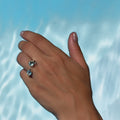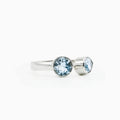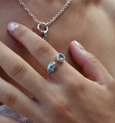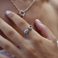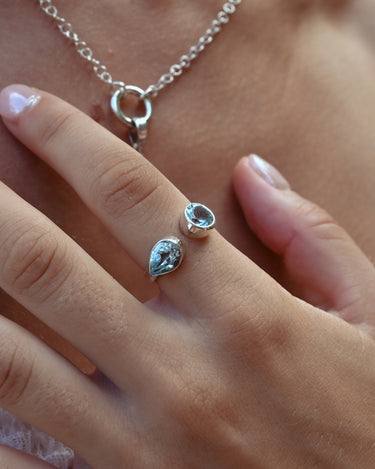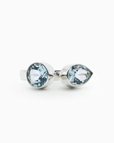 Open and fluid in form, the Azurea Ring captures the meeting of sea and sky. Handcrafted in sterling silver, it features two blue topaz stones: one round, one teardrop. Symbolizing balance, freedom, and flow.