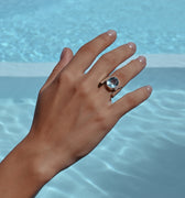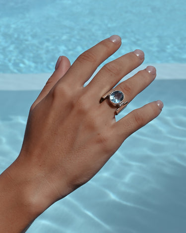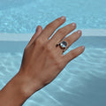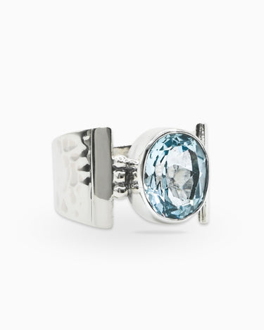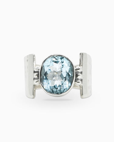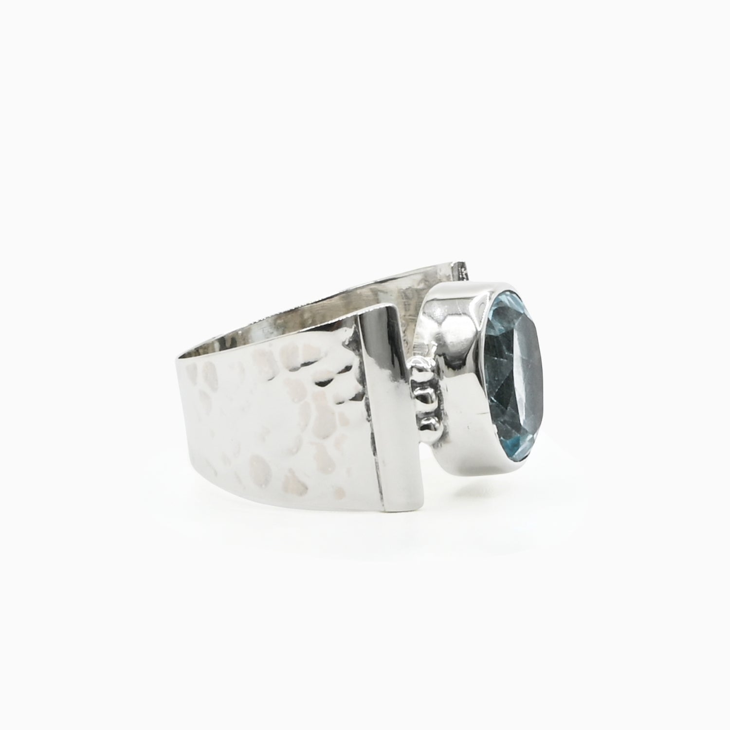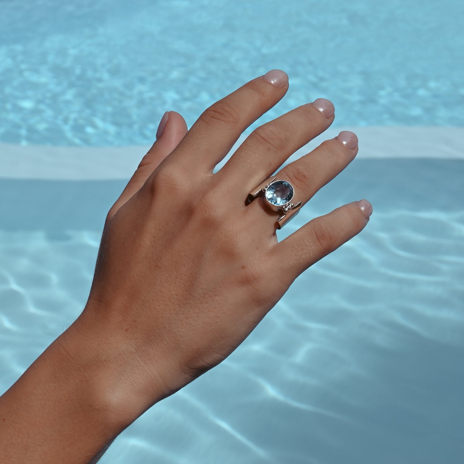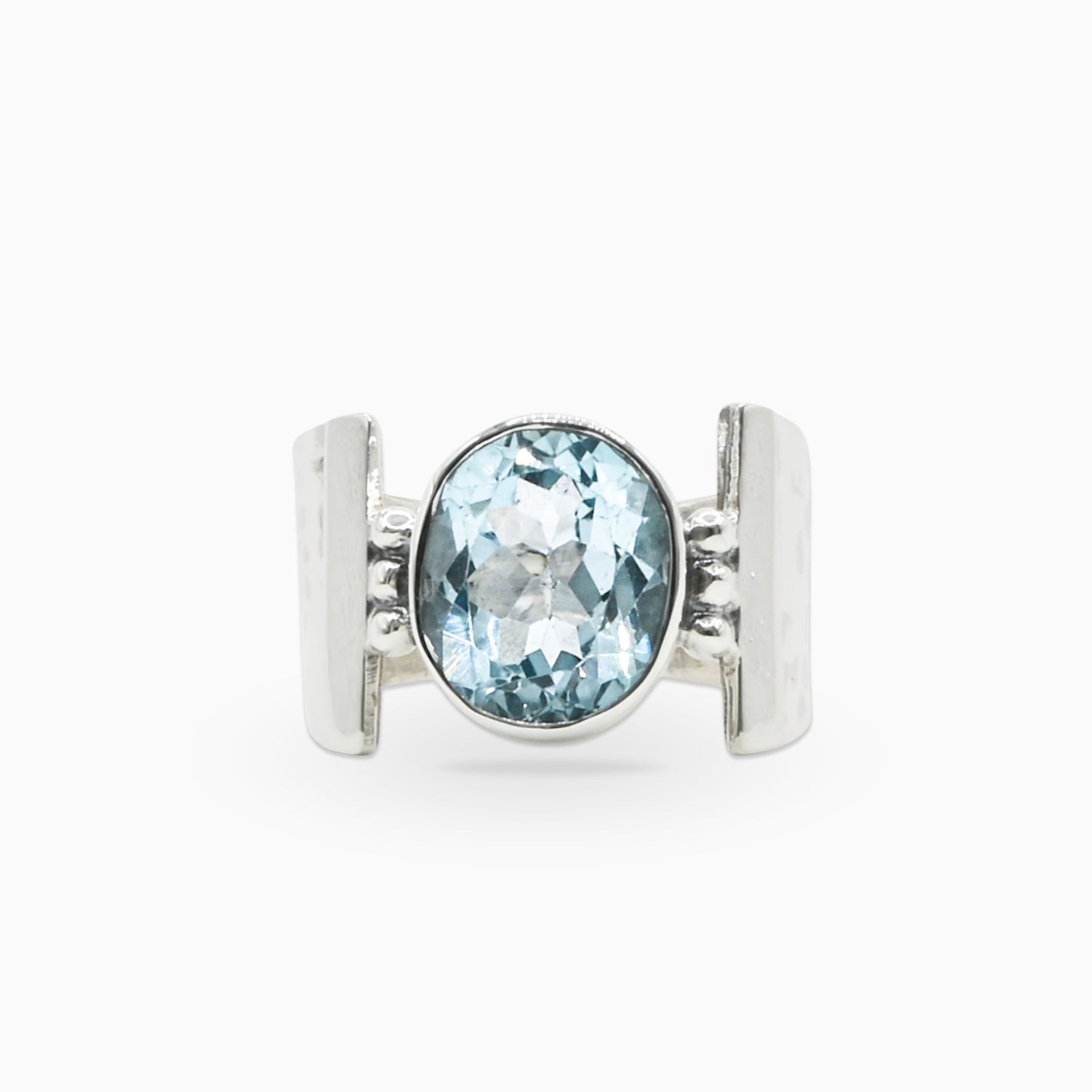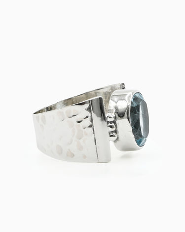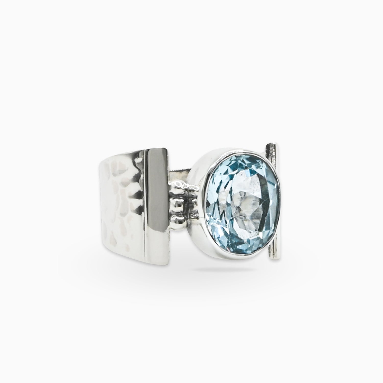 The Ocea Ring channels the quiet strength of the sea: calm, fluid, and ever-changing. Handcrafted in sterling silver with a hammered finish and a luminous blue topaz at its centre, it mirrors the rhythm of the tides and the shimmer of light on open water.