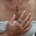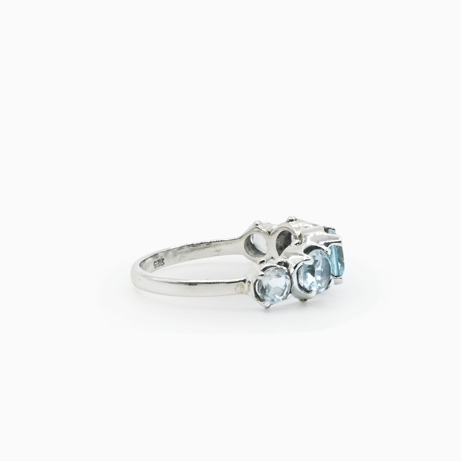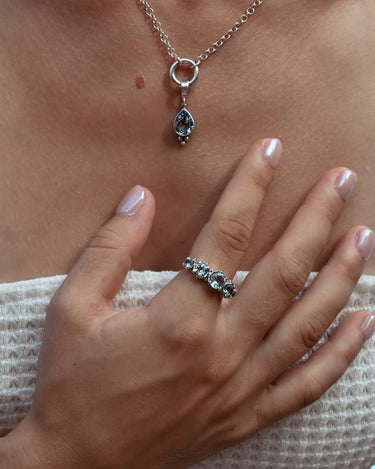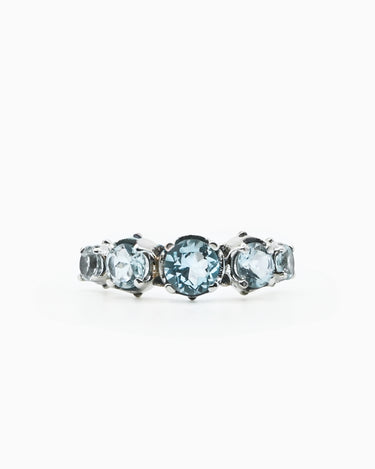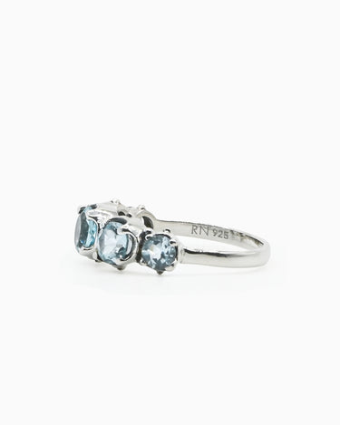 Inspired by the Greek goddess of the sea, the Thalassa Ring mirrors the calm allure of ocean light. Handcrafted in sterling silver and adorned with five blue topaz stones, it captures the delicate shimmer of sun glitter dancing across the waves: serene, timeless, and powerful in its stillness.
